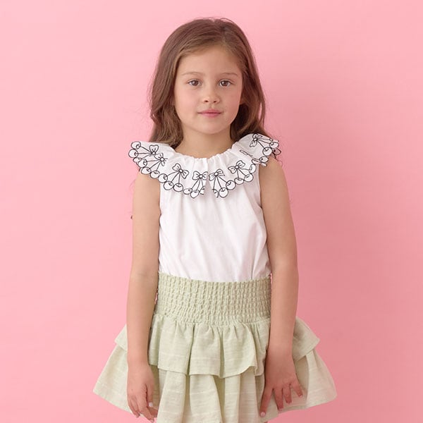 顔周りを華やかに彩る、チェリーとリボンのレース衿が繊細なデザインが、上品で可愛らしい印象を与えてくれます。