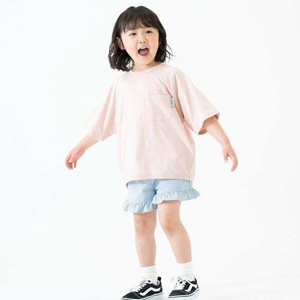 裾にフリルを入れて、かわいらしさをプラス!主張しすぎないデザインと、やわらかく夏らしい色合いのショートパンツで、合わせるトップスを選びません。