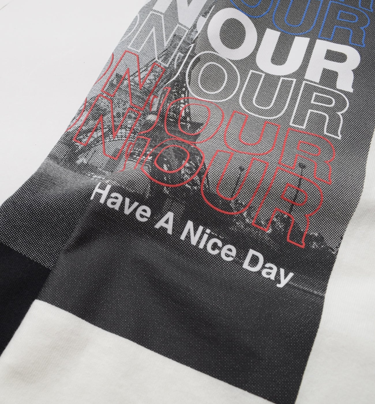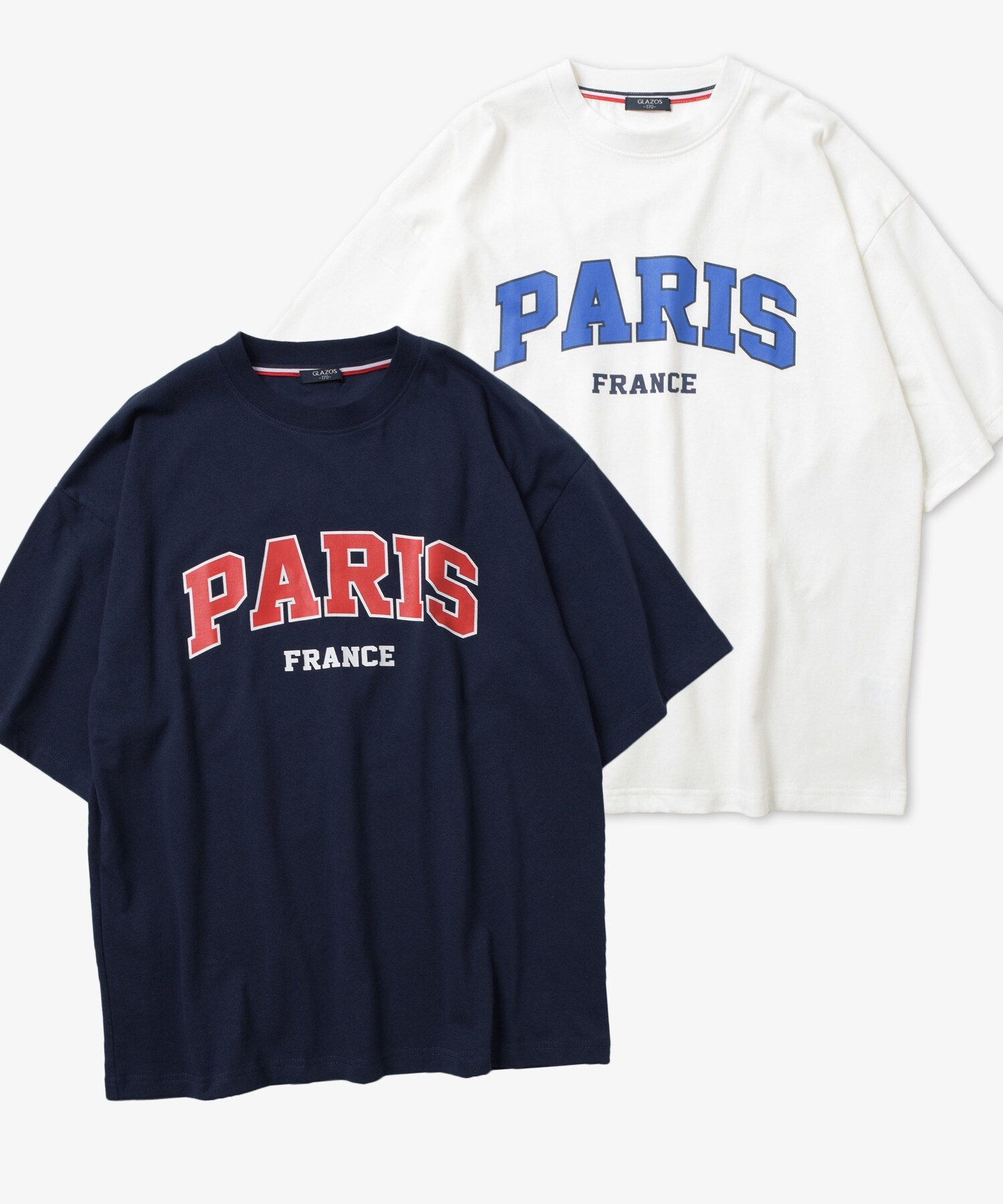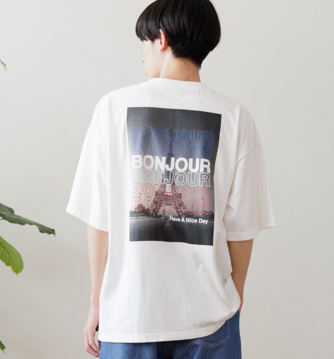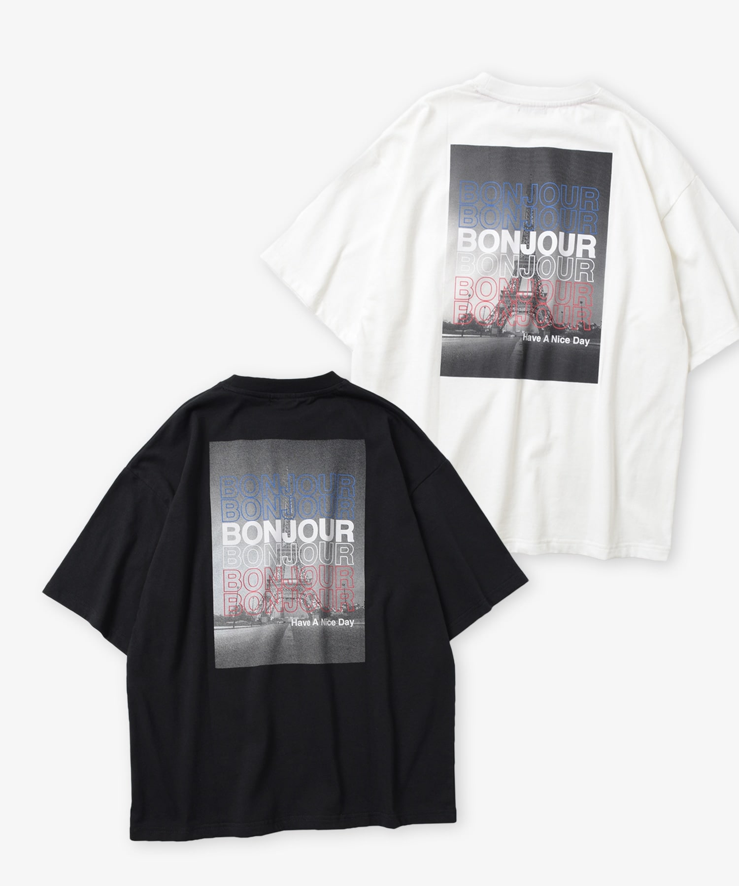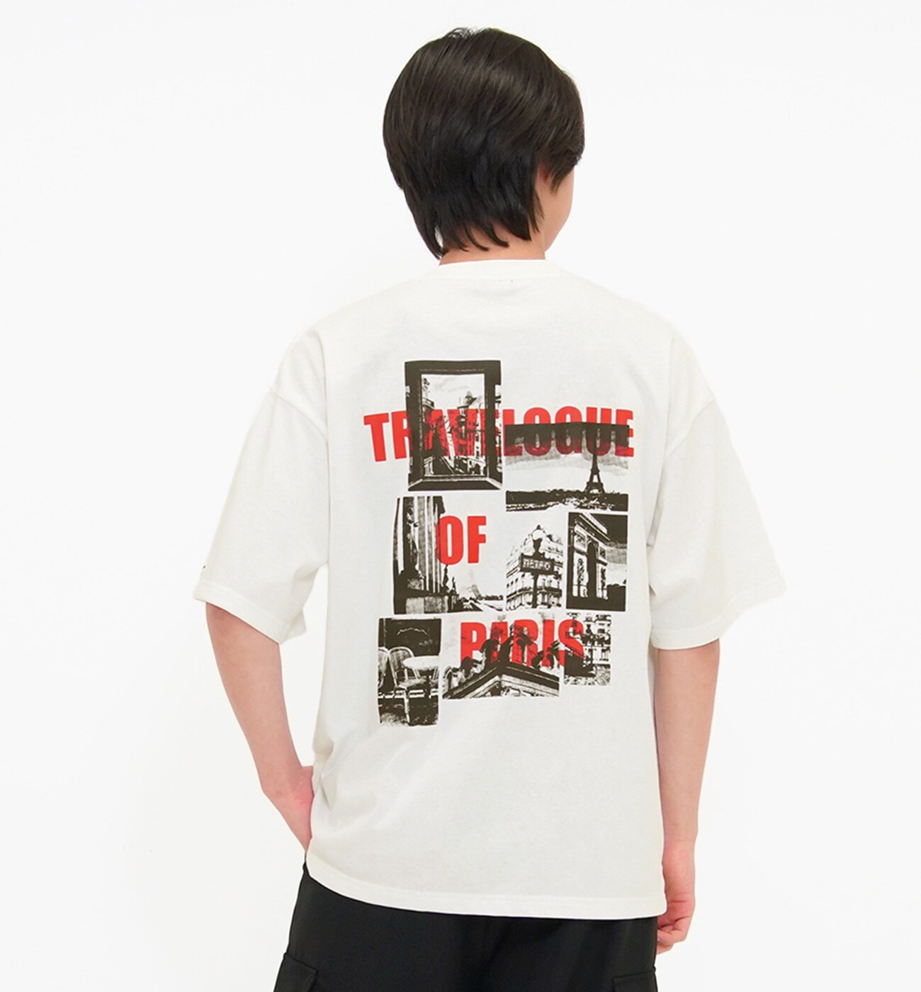 パリの街並みのフォトをコラージュしたデザインで、きれいめにもカジュアルにも着こなせるアイテムです。