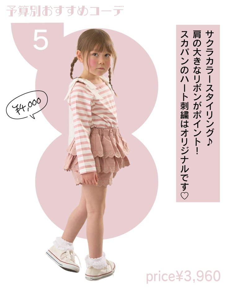 肩リボンのボーダーTにガーリーなスカパン、上下ピンクで揃えて思いっきりかわいく♡リセのスカパンはデザインいろいろ、お気に入りがきっと見つかります。