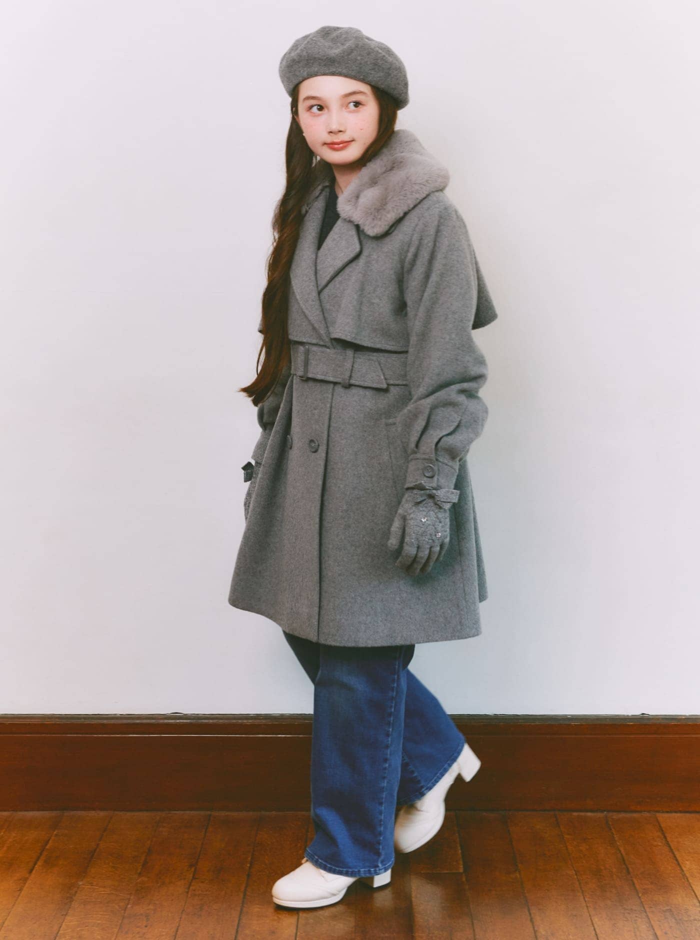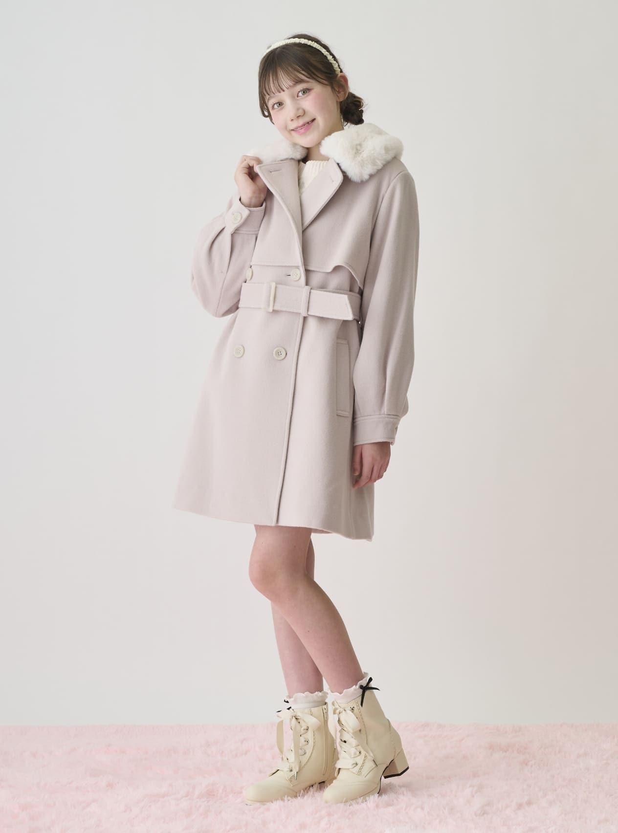 ケープ風デザインが上品な印象を添えるミドルコート。ふわふわのフェイクファーティペットは取り外しでき、気分に合わせた着こなしが楽しめます。スタンドカラーで首元まであたたかく、冷たい風をしっかりガード。ウエストベルトを締めればスタイルアップも叶う、大人っぽく着こなせる一着です。