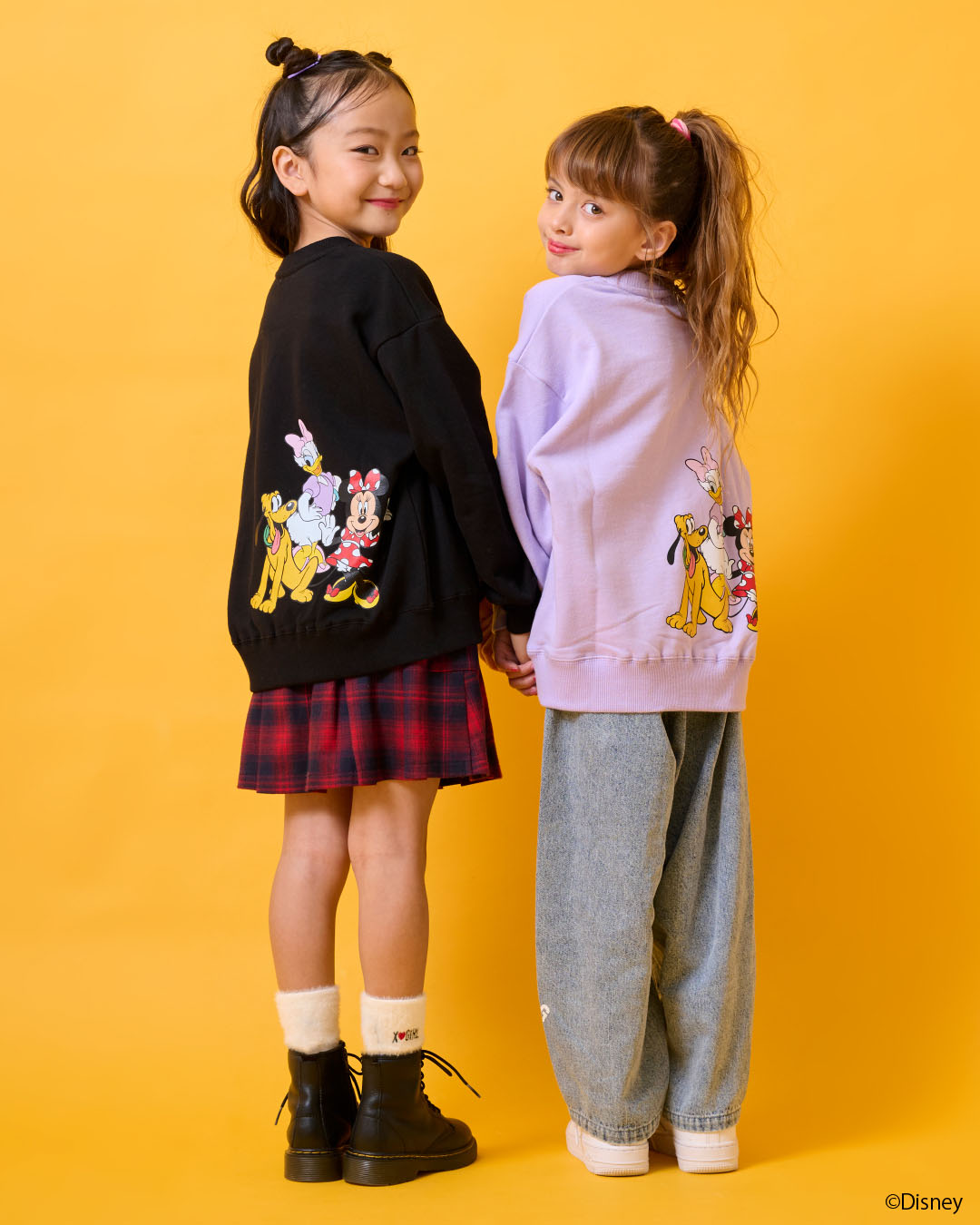 キャラクターたちのバックプリントに心惹かれるトレーナーは、胸元のブランドロゴを明るい配色にすることで、女の子らしい印象をプラス♪姉妹やお友達とお揃いも楽しめるアイテム!