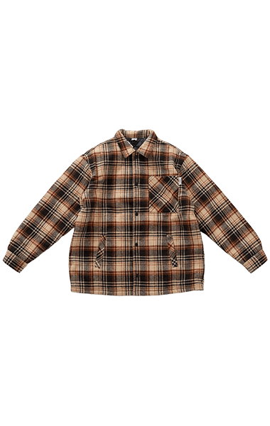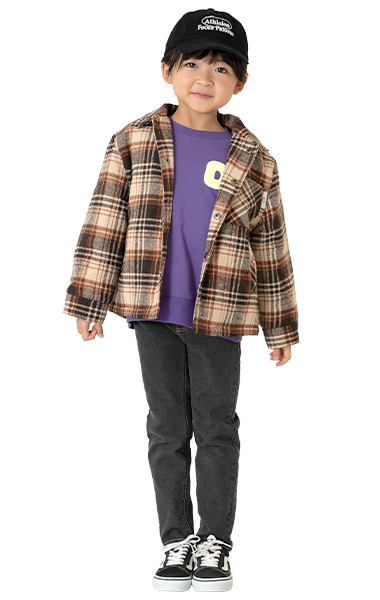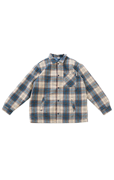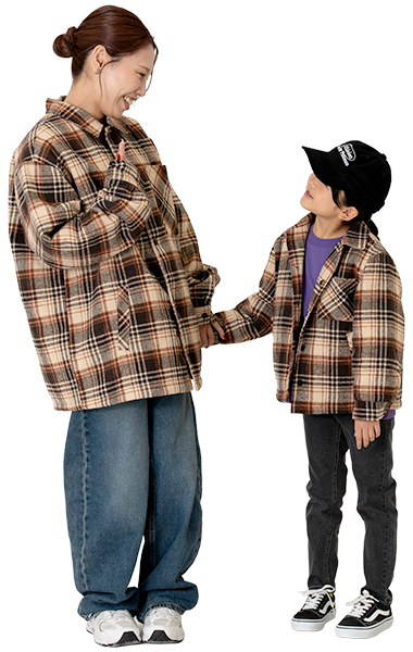 去年も大人気だったチェックジャケット。トレンドカラーの茶色と古着らいくなブルーカラーでこなれた着こなしに。ママから180くらいまでのパパも着られるFREEサイズです。