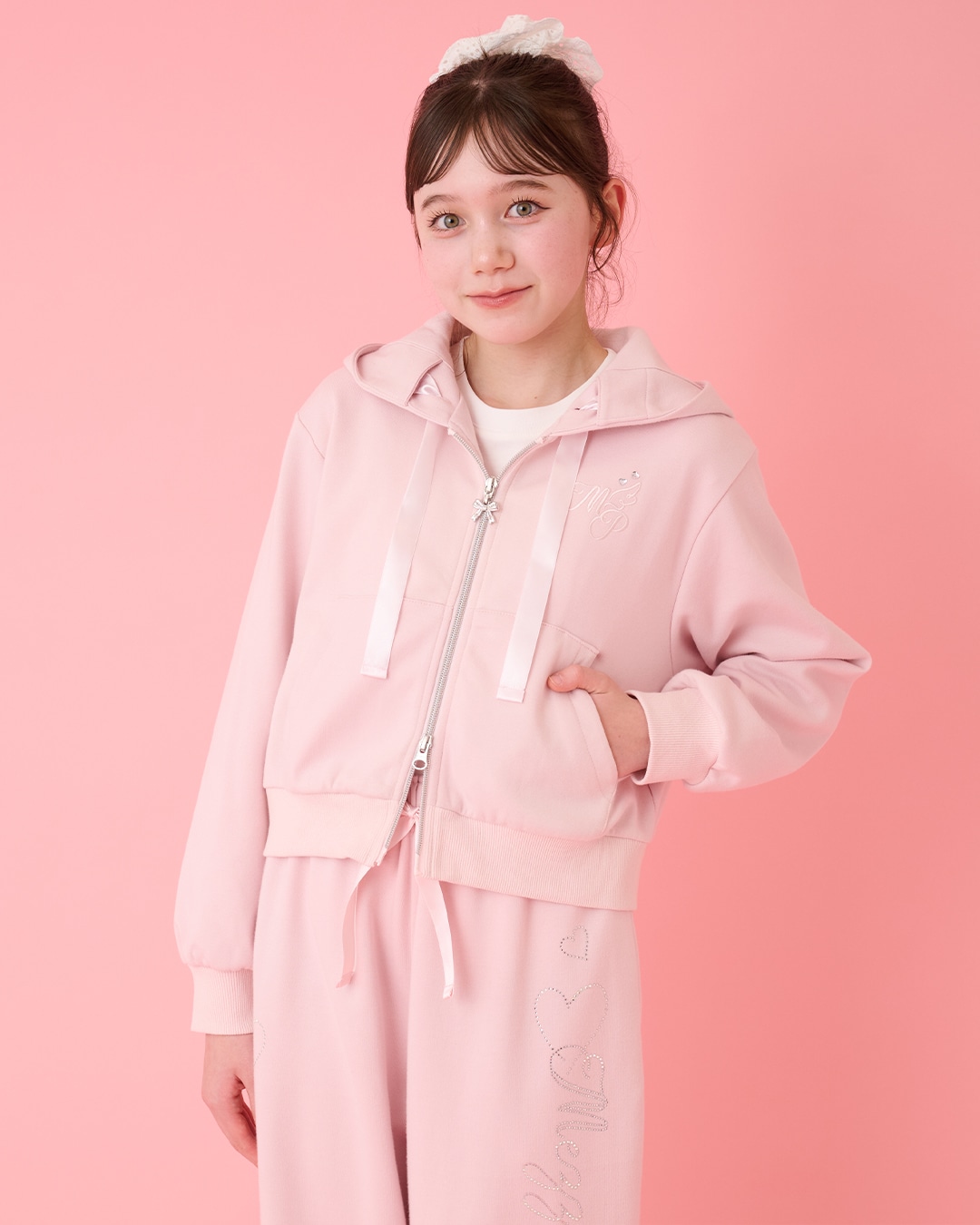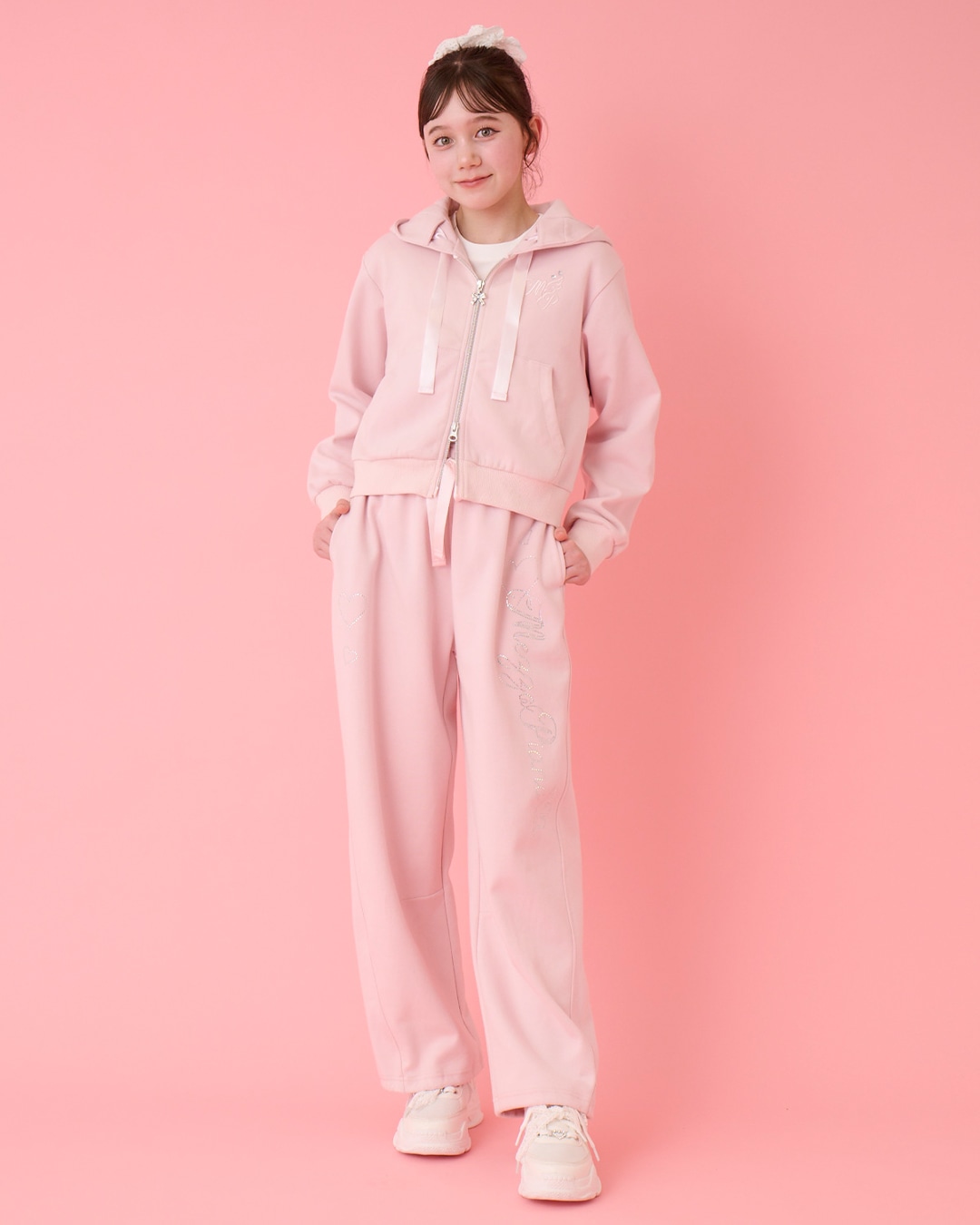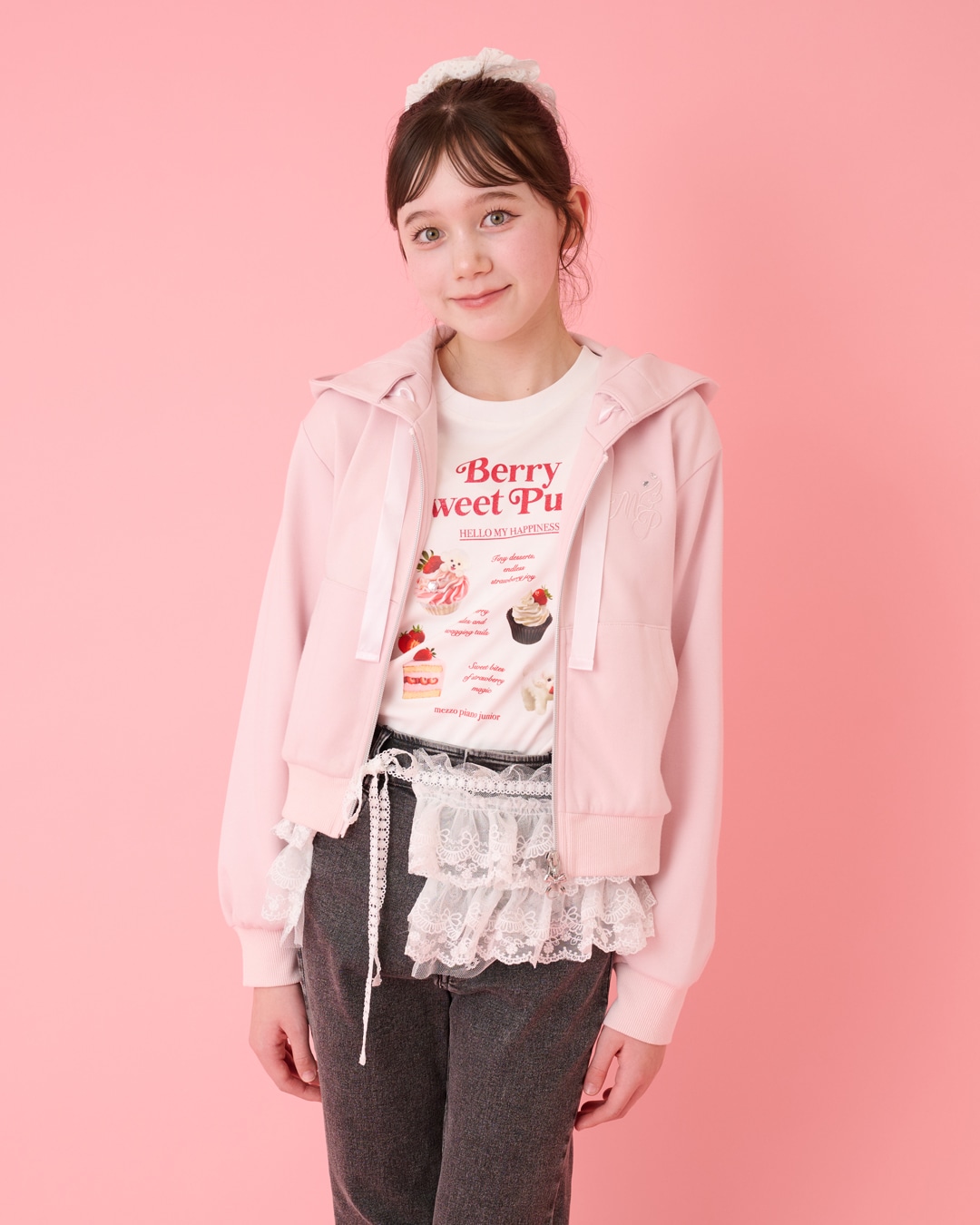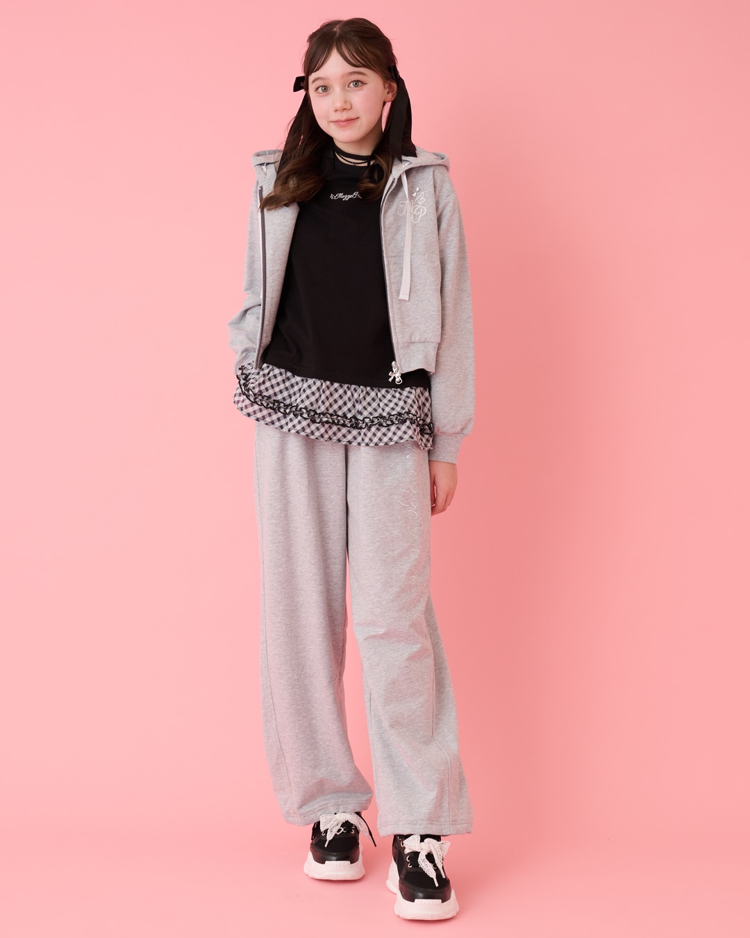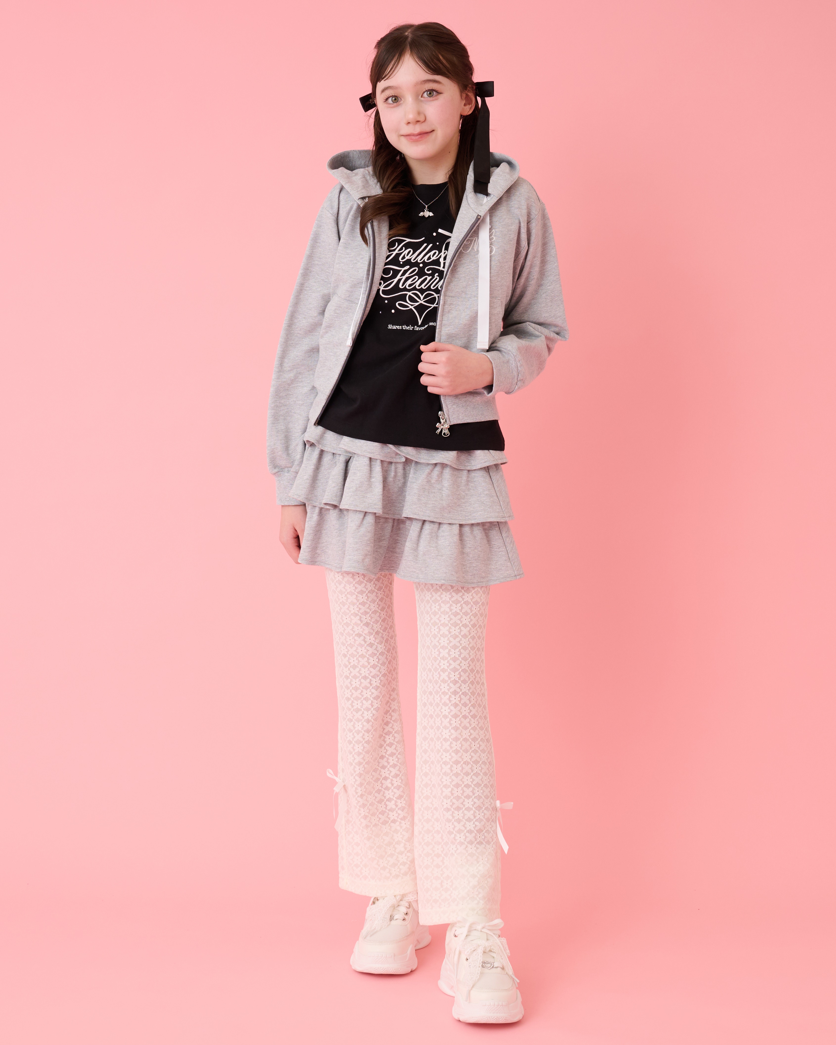 スウェットパーカに、フリルスカートとレースパンツを合わせた最旬ガーリーコーデ。