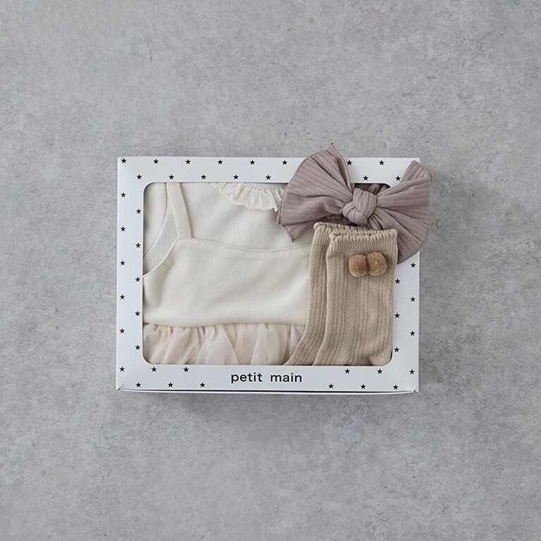 ふわもこ素材のロンパースとアニマルモチーフの小物が可愛らしいギフトセット。うさぎの顔があしらわれたビーニーとソックスは、見ているだけで心が弾む、なりきり気分を味わえるラインナップです。