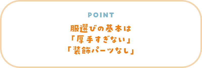 肌着、トップス、ボトムスすべてに言えることは、まず厚手すぎないことですかね。