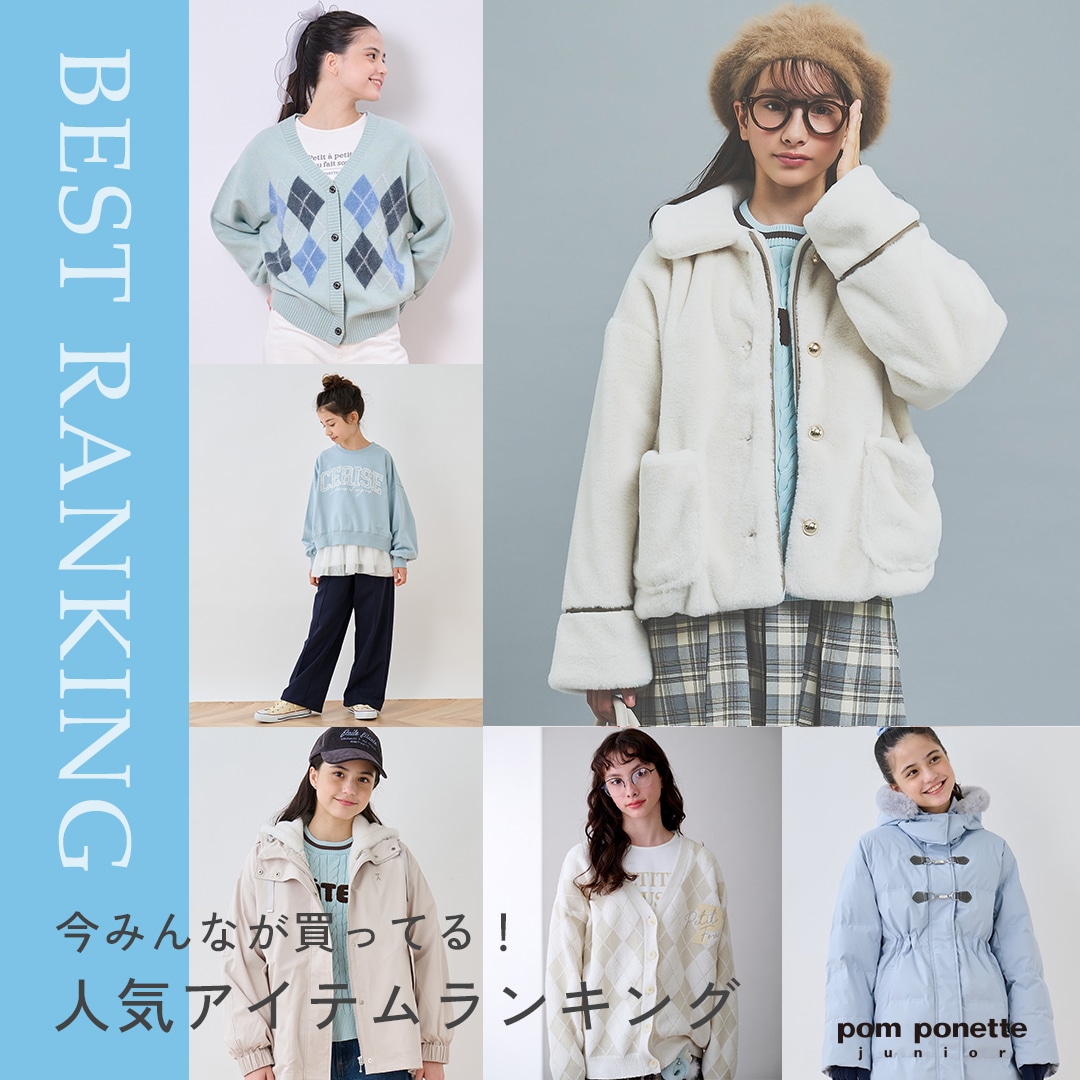 ポンポネットジュニア今売れているアイテムランキングTOP10 RANKING 今みんなが買っている! 店舗での売れ筋TOP10をご紹介。 クリアランスセールがスタート! 今すぐ着れるセールアイテムが 上位にランクイン♪ No.1 Aラインダウンコート ≫ ¥39,600 ⇒ ¥19,800(50%OFF) No.2 3WAYマウンテンパーカ ≫ ¥27,500 ⇒ ¥13,750(50%OFF) No.3 アーガイルニットカーデ ≫ ¥17,490 ⇒ ¥13,992(20%OFF) No.4 ロゴジャカードニット ≫ ¥11,990 ⇒ ¥8,393(30%OFF) No.5 フェイクファーブルゾン ≫ ¥19,800 ⇒ ¥13,860(30%OFF) No.6 サスつきワイドパンツ ≫ ¥16,390 ⇒ ¥11,473(30%OFF) No.7 サガラロゴニット ≫ ¥13,090 ⇒ ¥6,545(50%OFF) No.8 バレルシルエットパンツ ≫ ¥16,390 ⇒ ¥8,195(50%OFF) No.9 ニットベスト×ロンT ≫ ¥17,490 ⇒ ¥8,745(50%OFF) No.10 カーディガン&インナーセット ≫ ¥17,490 オンラインでの売れ筋ランキングはこちら↓ ランキング一覧をチェック ≫ CHECK! CHECK! CHECK! \MAX50%OFF/ クリアランスセール開催中! セールアイテムをチェック ≫